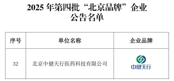 近日,北京企協(xié)正式發(fā)布2025年第四批 “北京品牌”企業(yè)評價公告,中健天行憑借突出的品牌知名度和綜合競爭力,成功榮獲“北京品牌”企業(yè)稱號。