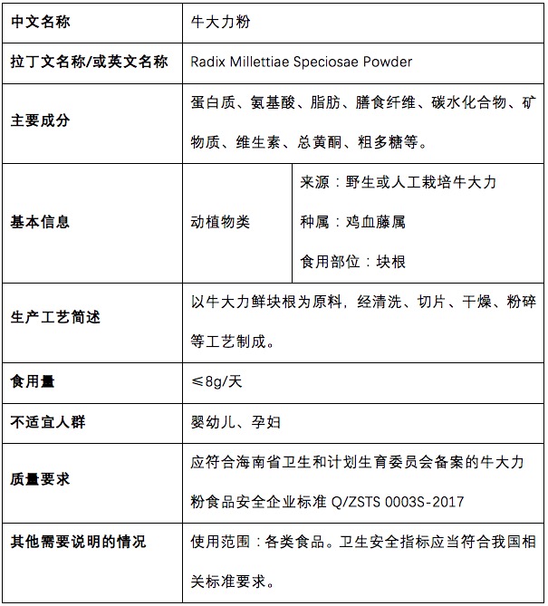 本次申報(bào)的新食品原料牛大力粉的使用范圍為單獨(dú)食用,或者添加到各類食品中使用。牛大力作為一種健康滋補(bǔ)食材,具有強(qiáng)筋壯骨、抗疲勞、無毒無副作用的特點(diǎn),攝入人群無明確的限制。根據(jù)對牛大力進(jìn)行的一系列安全性考察,在最大食用劑量為8.0g/天時(shí)是安全的。所以在此次申請中我們推薦為牛大力粉食用量為每日≤8g。