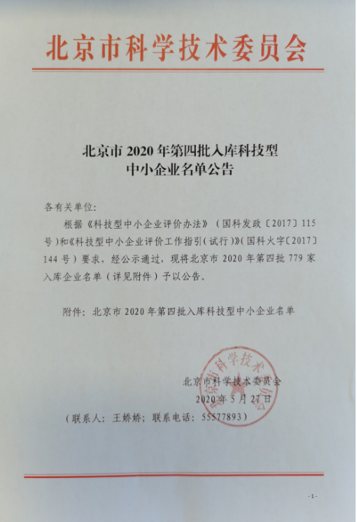 祝賀我司入庫北京市2020年全國科技型中小企業(yè)!