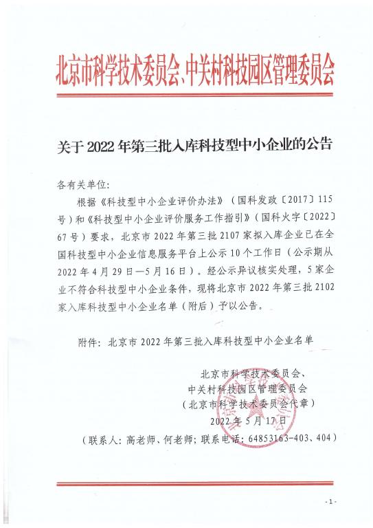 根據(jù)《科技型中小企業(yè)評價辦法》(國科發(fā)政〔2017〕115號)和《科技型中小企業(yè)評價服務(wù)工作指引》(國科火字〔2022〕67號)有關(guān)規(guī)定,2022年我公司再次成功入庫北京市全國科技型中小企業(yè)。我公司自2018年以來被認定為“北京市科技型中小企業(yè)”,以連續(xù)四年獲此稱號,這是我公司研究開發(fā)服務(wù)取得的又一喜人成果,是我公司走向科技型企業(yè)發(fā)展的一個巨大突破,更是有關(guān)政府部門對我司研發(fā)和技術(shù)服務(wù)的充分認可。