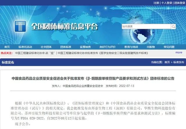 8月12日,由中國(guó)食品藥品企業(yè)質(zhì)量安全促進(jìn)會(huì)提出并歸口的《β-煙酰胺單核苷酸產(chǎn)品要求和測(cè)試方法》團(tuán)體標(biāo)準(zhǔn)正式實(shí)施,適用于進(jìn)出口原料β-煙酰胺單核苷酸產(chǎn)品的質(zhì)量控制。