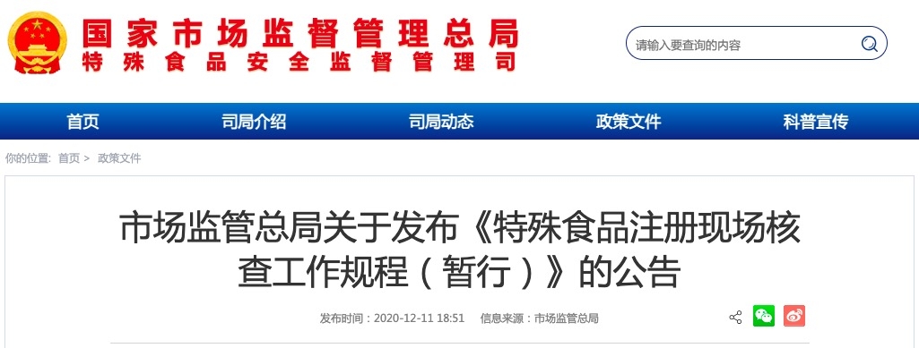 市場(chǎng)監(jiān)管總局發(fā)布《特殊食品注冊(cè)現(xiàn)場(chǎng)核查工作規(guī)程(暫行)》