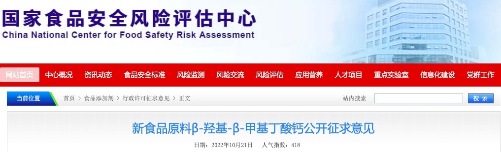 國家衛(wèi)生健康委員會委托,根據(jù)《食品安全法》和《新食品原料安全性審查管理辦法》的規(guī)定,β-羥基-β-甲基丁酸鈣申報新食品原料已通過專家評審委員會技術(shù)審查,現(xiàn)公開征求意見,請于2022年11月21日前將意見反饋至我中心,逾期將不予處理。