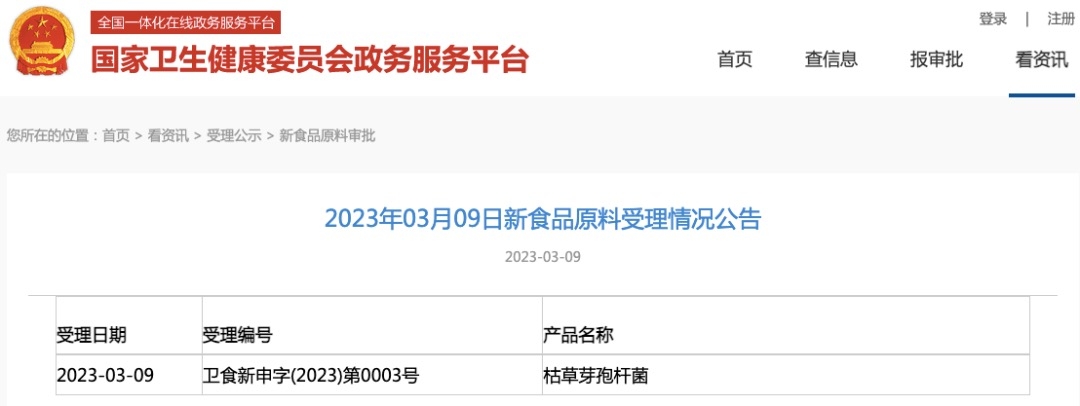 新食品原料 | 國家衛(wèi)健委發(fā)布枯草芽孢桿菌受理公告