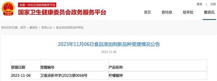 食品添加劑新品種 | 國(guó)家衛(wèi)健委發(fā)布檸檬酸鉀受理公告