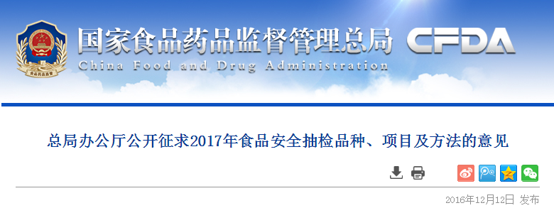 總局辦公廳公開征求2017年食品安全抽檢品種、項目及方法的意見