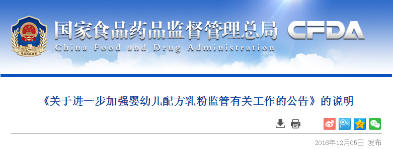 2016年12月2日,總局發(fā)布了《關于進一步加強嬰幼兒配方乳粉監(jiān)管有關工作的公告》(以下簡稱《公告》)。現(xiàn)將有關問題說明如下: