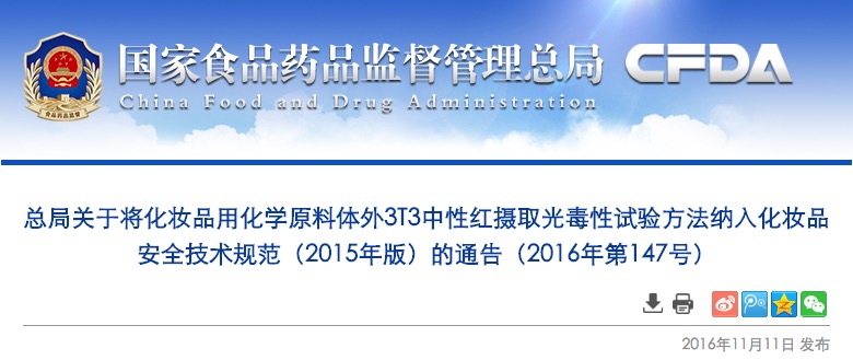 總局關(guān)于將化妝品用化學(xué)原料體外3T3中性紅攝取光毒性試驗(yàn)方法納入化妝品安全技術(shù)規(guī)范(2015年版)的通告(2016年第147號(hào))