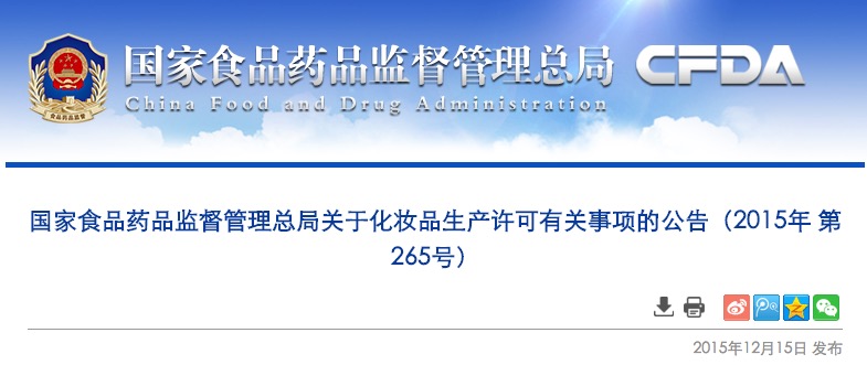 國(guó)家食品藥品監(jiān)督管理總局關(guān)于化妝品生產(chǎn)許可有關(guān)事項(xiàng)的公告(2015年 第265號(hào))