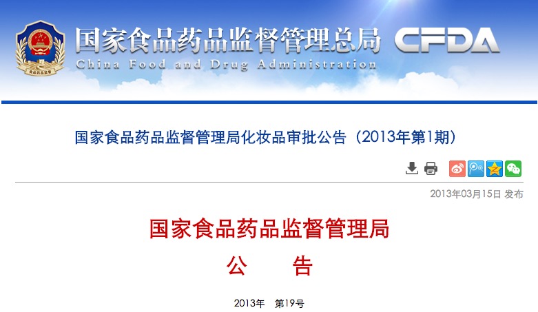 國(guó)家食品藥品監(jiān)督管理局化妝品審批公告(2013年第1期)