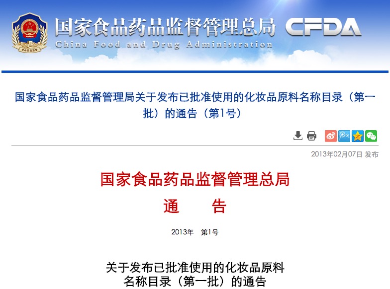 國家食品藥品監(jiān)督管理局關于發(fā)布已批準使用的化妝品原料名稱目錄(第一批)的通告(第1號)