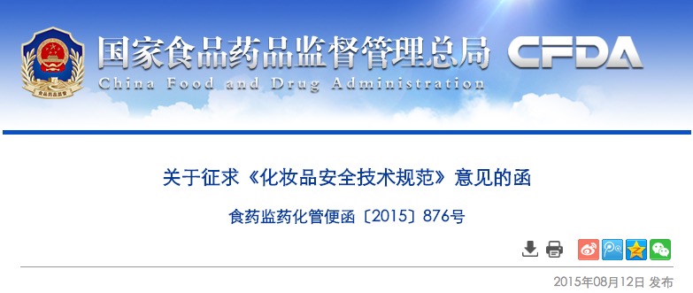 為進一步完善化妝品安全技術(shù)法規(guī)體系,結(jié)合我國化妝品行業(yè)發(fā)展和監(jiān)管實際,我司組織對《化妝品衛(wèi)生規(guī)范》(2007年版)進行修訂,形成了《化妝品安全技術(shù)規(guī)范》(征求意見稿)?,F(xiàn)公開征求意見,請于2015年9月1日前將有關(guān)意見以電子郵件形式反饋化妝品標(biāo)委會秘書處(電子郵箱:hzpbwh@nifdc.org.cn)。