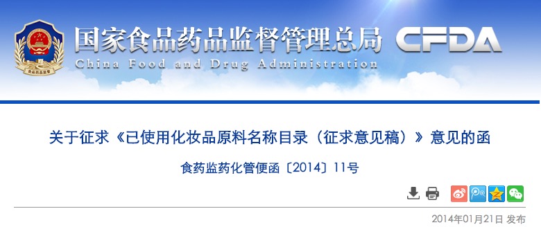為進(jìn)一步加強(qiáng)化妝品原料管理,在原國家食品藥品監(jiān)督管理局發(fā)布的第一批、第二批《已批準(zhǔn)使用的化妝品原料名稱目錄》的基礎(chǔ)上,我司對已使用的化妝品原料目錄作了進(jìn)一步梳理工作,形成了《已使用化妝品原料名稱目錄(征求意見稿)》?,F(xiàn)公開征求意見,請于2014年2月20日前將意見和建議以電子郵件形式反饋我司。