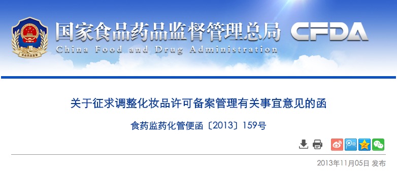 為進一步加強化妝品許可及備案管理工作,保障消費者健康權益,我司組織起草了《關于調整化妝品許可備案管理有關事宜的通知》(征求意見稿)?,F(xiàn)公開征求意見,請于2013年11月12日前將有關意見反饋我司。
