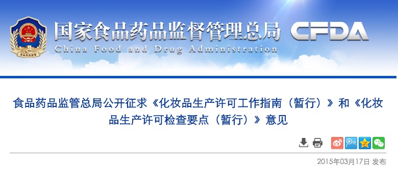 食品藥品監(jiān)管總局公開征求《化妝品生產(chǎn)許可工作指南(暫行)》和《化妝品生產(chǎn)許可檢查要點(暫行)》意見