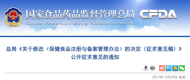為進一步落實行政審批制度改革精神,規(guī)范和加強保健食品注冊備案管理工作,食品藥品監(jiān)管總局起草了《關(guān)于修改〈保健食品注冊與備案管理辦法〉的決定(征求意見稿)》。為凝聚各界的智慧和力量參與食品安全治理,按照科學立法和民主立法的原則,現(xiàn)公開征求意見。請于2018年1月29日前,通過以下四種方式提出意見和建議: