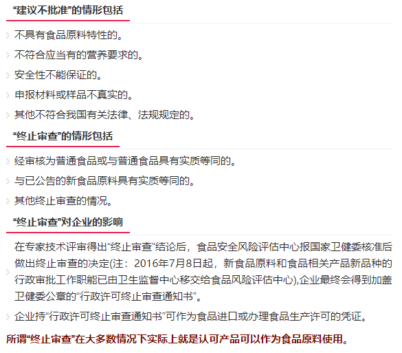 依據(jù)《新食品原料安全性審查規(guī)程》,新食品原料審查和批準共涉4類情形:“延期再審”、“建議不批準”、“終止審查”和“建議批準”。