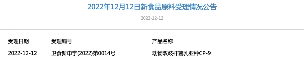 國(guó)家衛(wèi)健委發(fā)布動(dòng)物雙歧桿菌乳亞種CP-9新食品原料受理公告